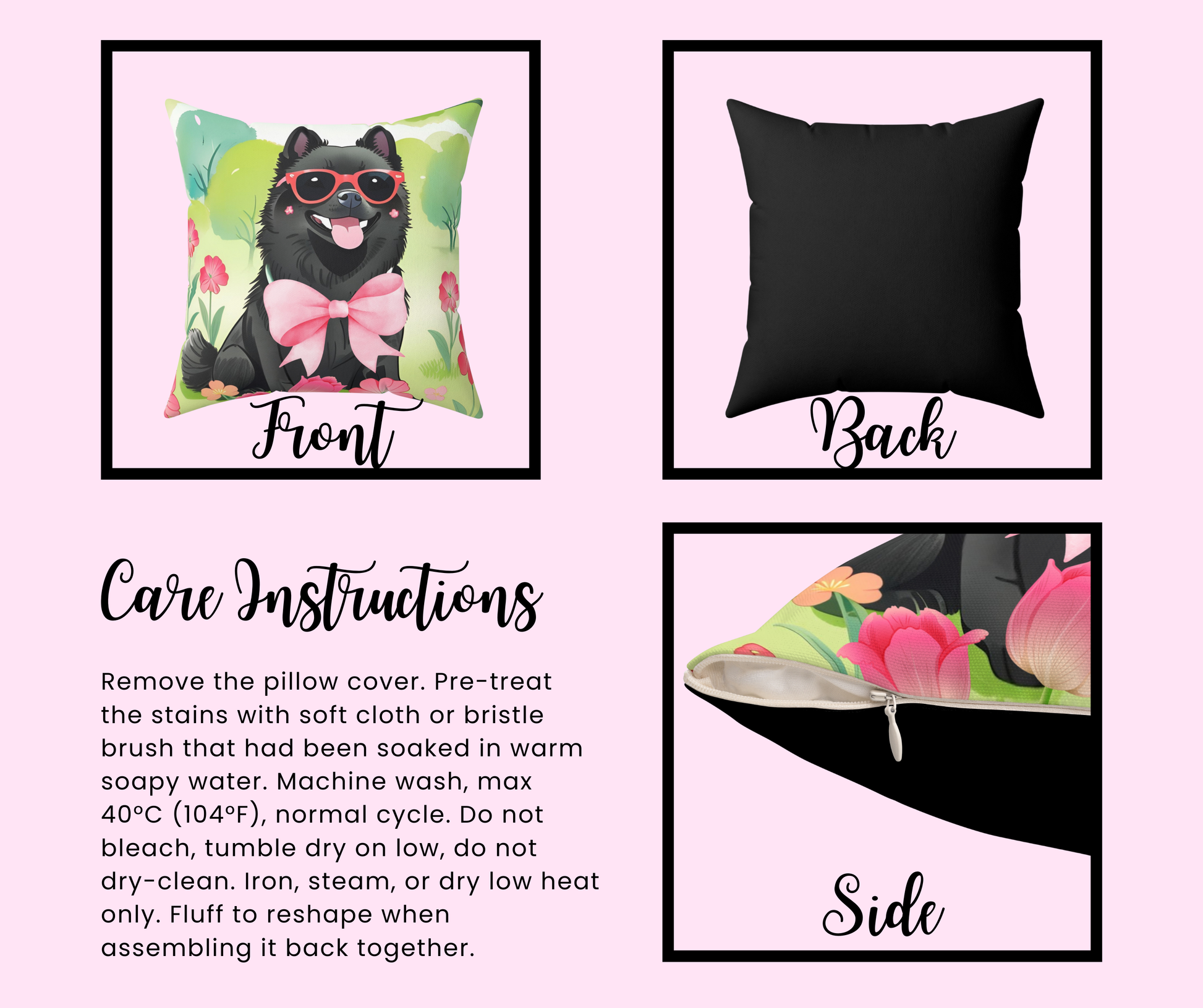 Bring the beauty of spring into your home with this Schipperke in Bloom throw pillow, featuring a vibrant garden design. Perfect for animal lovers and those who appreciate floral decor, this pillow adds a touch of seasonal charm to any room. Ideal for springtime, Mother's Day, or simply adding a pop of color to your living space. Product features - 100% Spun polyester fabric for shape retention and wrinkle resistance - Beige plastic zipper with metal head for a stylish finish - Not pre-assembled to minimize creasing during shipment - Recycled polyester insert for extra volume in the pillow - Double sided print for added design impact Care instructions - Remove the pillow cover. Pre-treat the stains with soft cloth or bristle brush that had been soaked in warm soapy water. Machine wash, max 40°C (104°F), normal cycle. Do not bleach, tumble dry on low, do not dry-clean. Iron, steam, or dry low heat only. Fluff to reshape when assembling it back together.